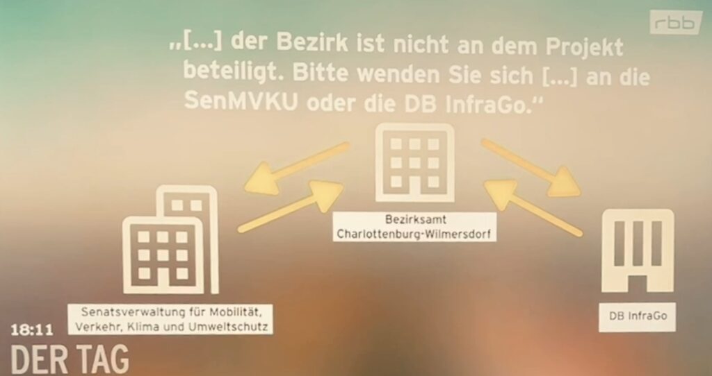 Auf Nachfrage des RBB wird von offizieller Seite die Zuständigkeit und Verantwortung jeweils auf die anderen geschoben…